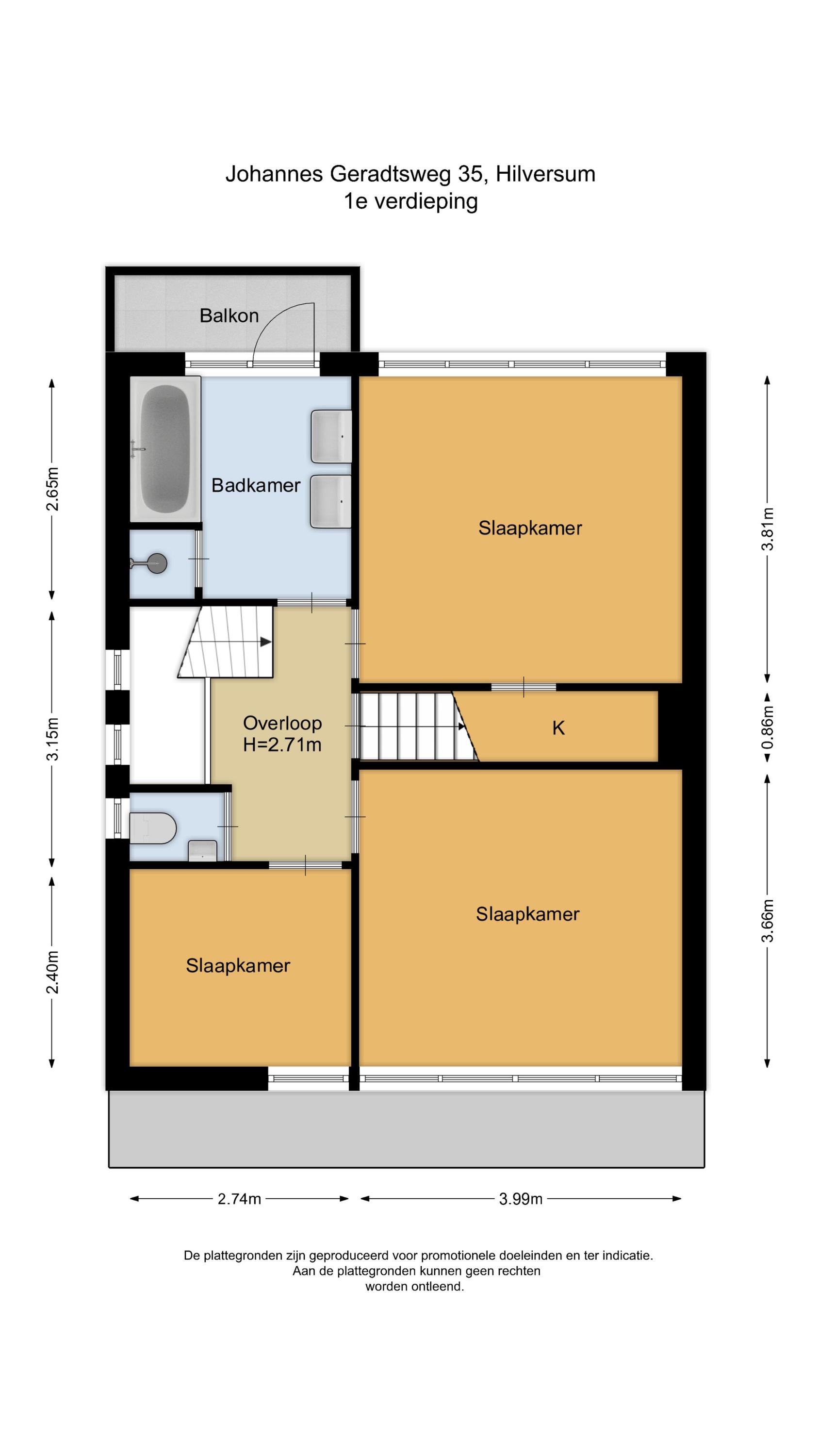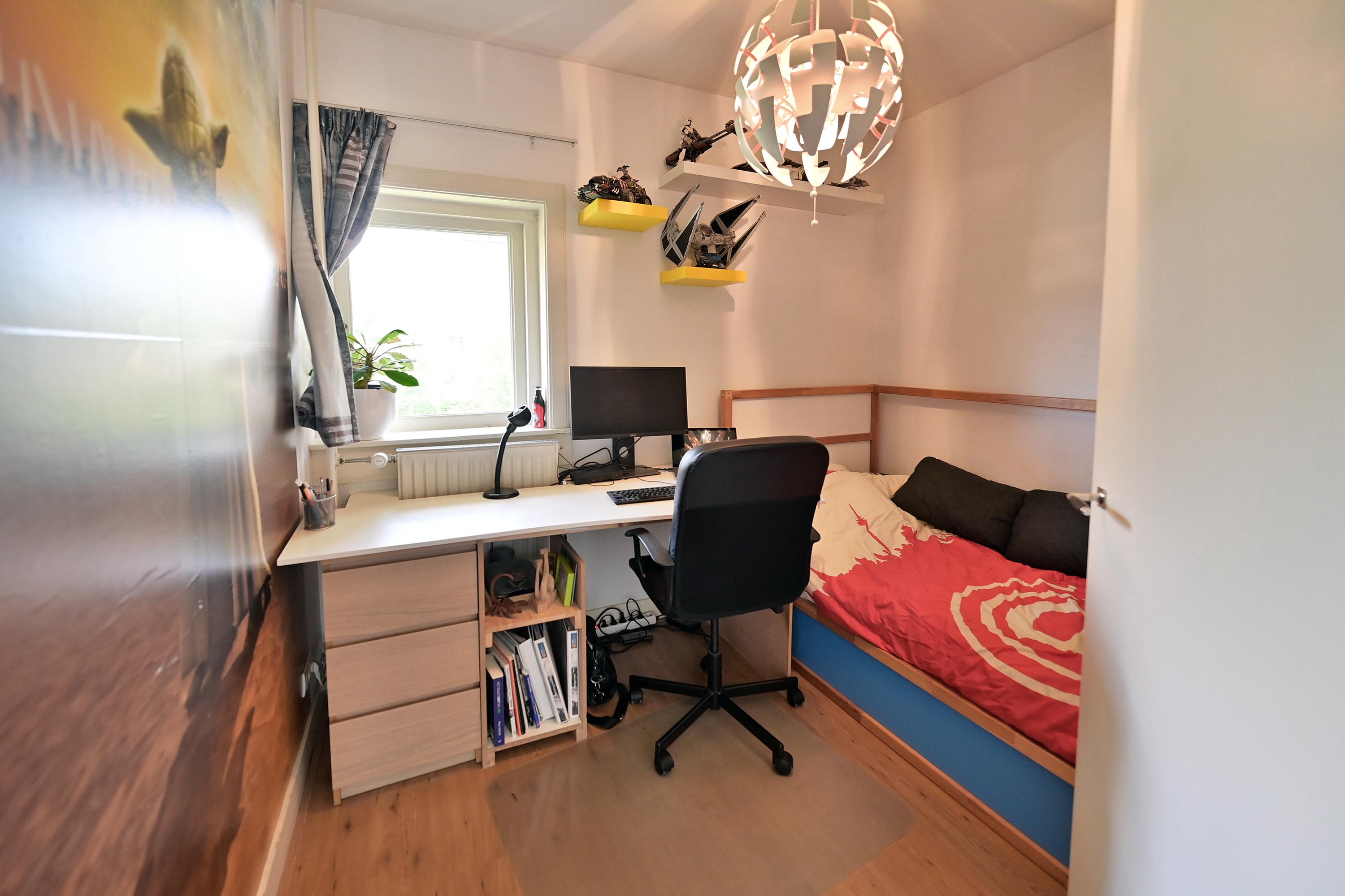 De slaapkamer aan de achterzijde heeft een grote inbouwkast. Aan de voorkant nog zo een ruime slaapkamer en een derde kleinere slaapkamer. De badkamer heeft een douche, een ligbad en een dubbele wastafel. Vanuit de badkamer is er een deur naar het balkon.