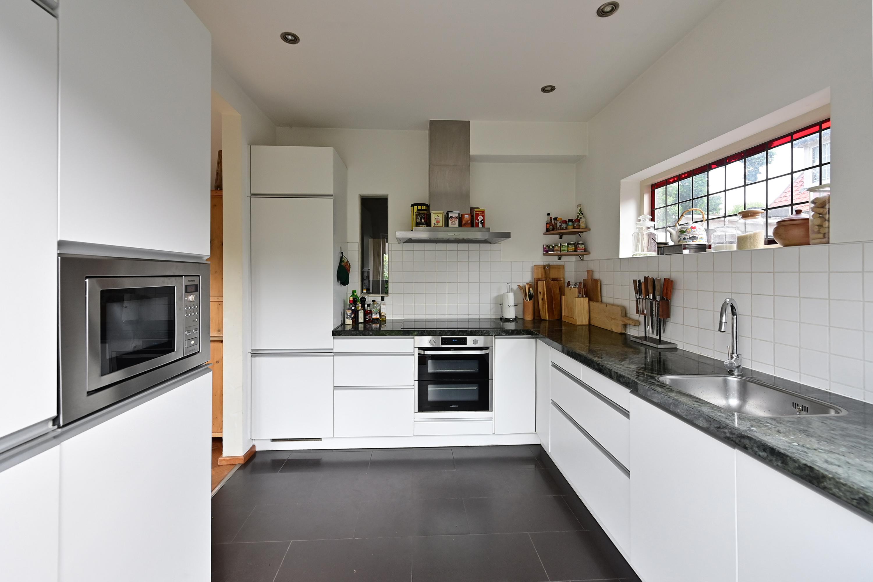 De ramen aan weerszijden van de keuken maken het ook hier tot een lichte en fijne ruimte. De keuken is in een hoekopstelling geplaatst en heeft een natuurstenen werkblad, een inductiekookplaat, een afzuigkap, een magnetron, een oven, een vaatwasser, een koelkast en een vriezer.