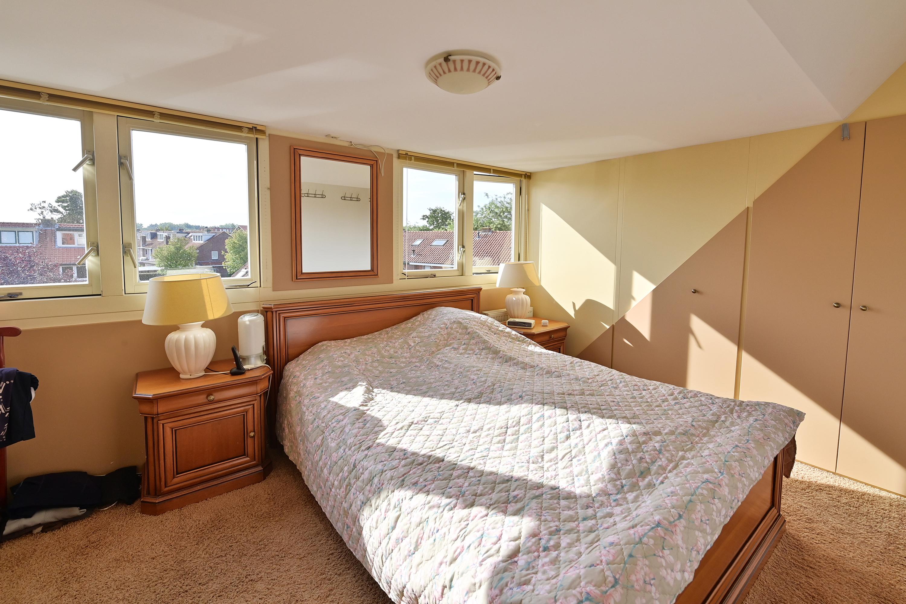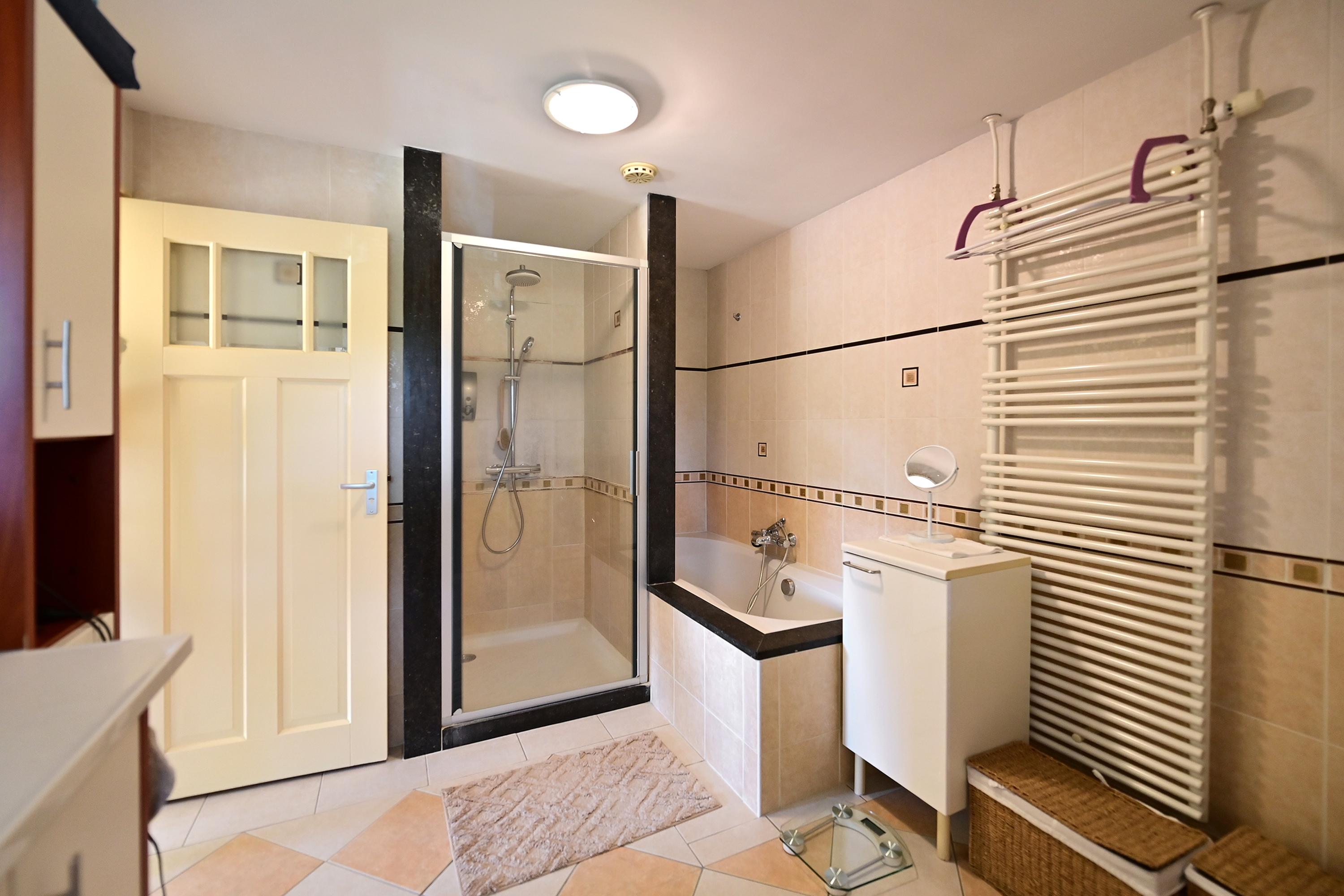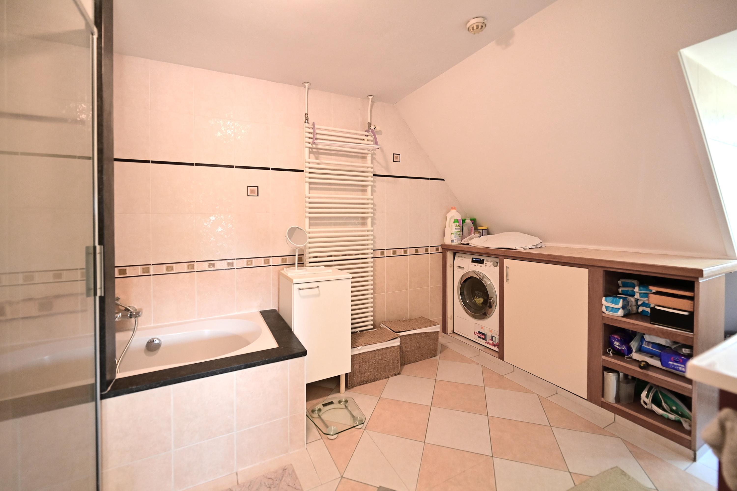 De tweede verdieping heeft 2 slaapkamers en grote badkamer met douche, bad, vaste wastafel en wasmachineaansluiting. Aparte wc.