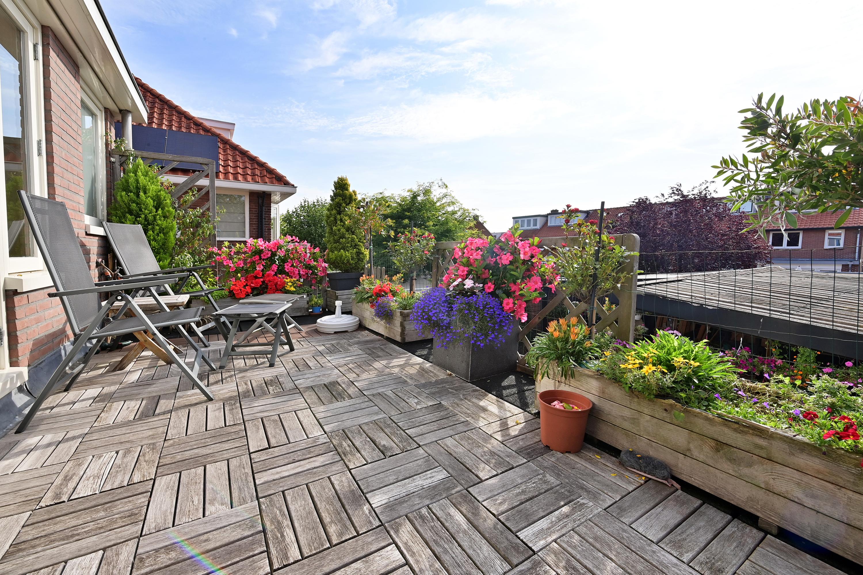 De eerste verdieping heeft een grote woonkamer, een riante woonkeuken met apparatuur, een toilet, openslaande deuren en een ruim balkon.
