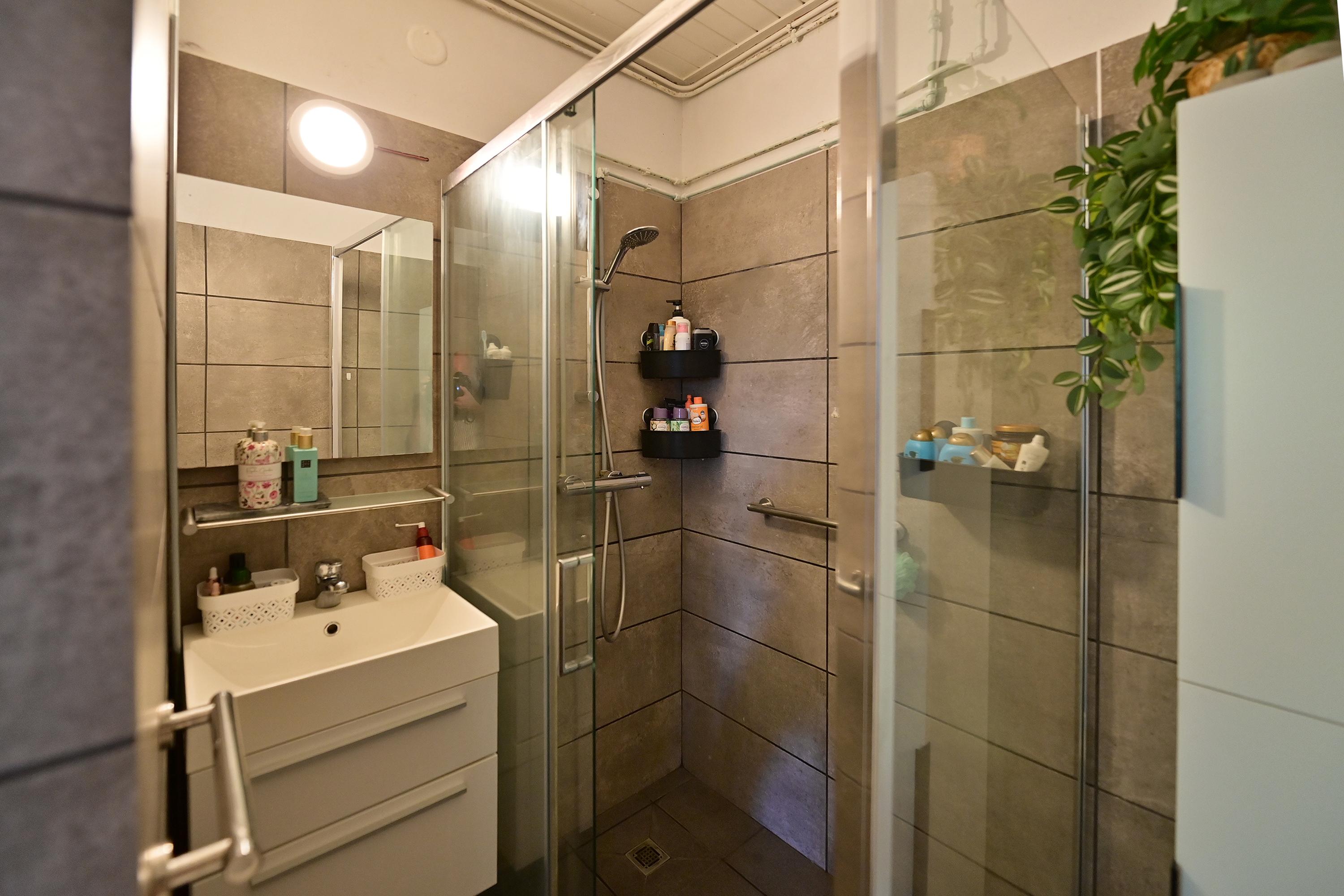 Een kleine hal vanuit de woonkamer biedt toegang tot het toilet en een moderne badkamer met een ruime douche en een wastafel met spiegelkast.