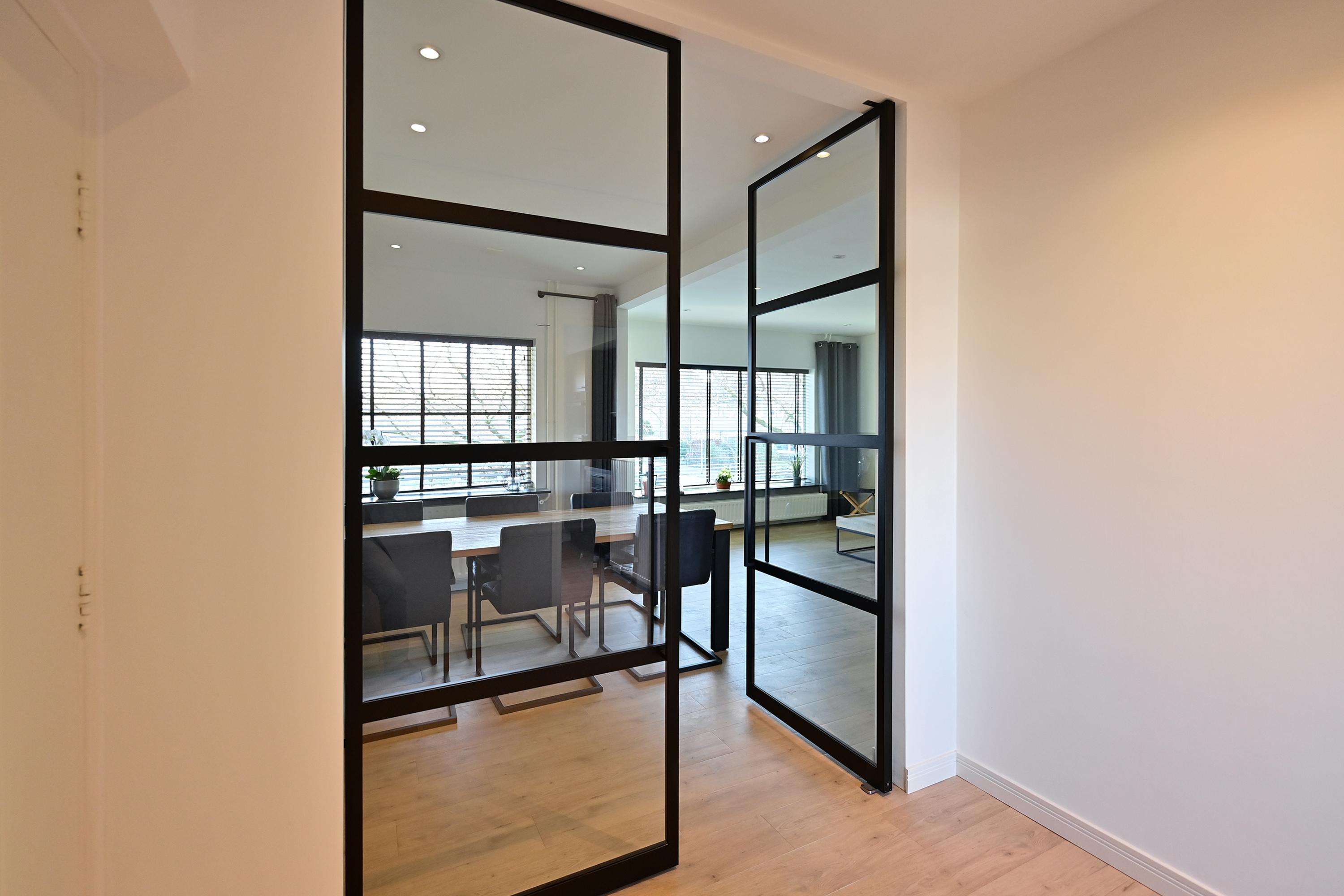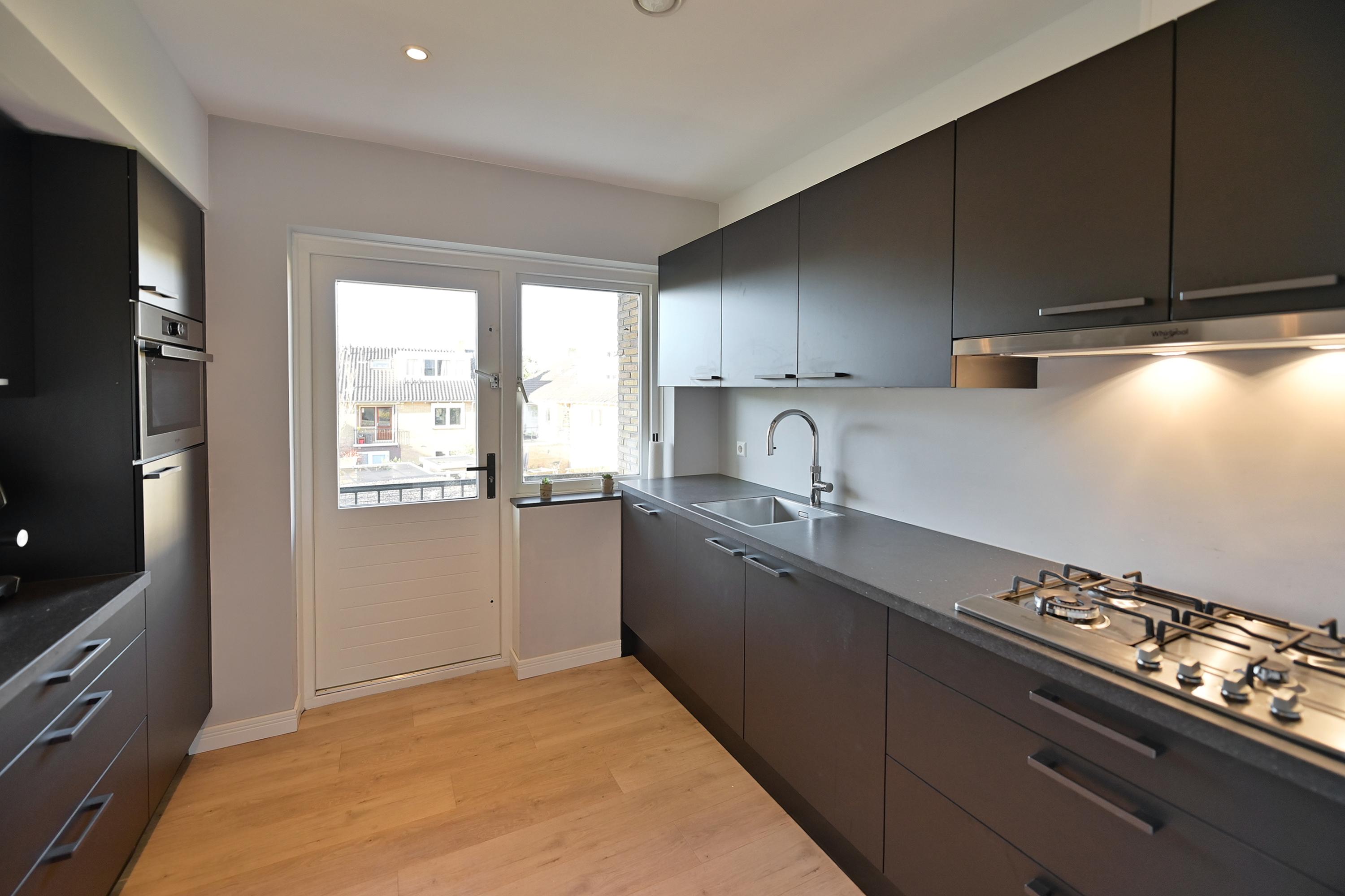Indeling: hal met moderne zwarte stalen taatsdeuren naar royale en lichte woonkamer met balkon aan de voorzijde, modern vrijhangend toilet, moderne keuken met apparatuur en koffiehoek aan de achterzijde. Vanuit de keuken toegang tot balkon op de westkant. Ruime slaapkamer met vaste kasten. Moderne badkamer met inloopdouche en luxe dubbel wastafelmeubel.