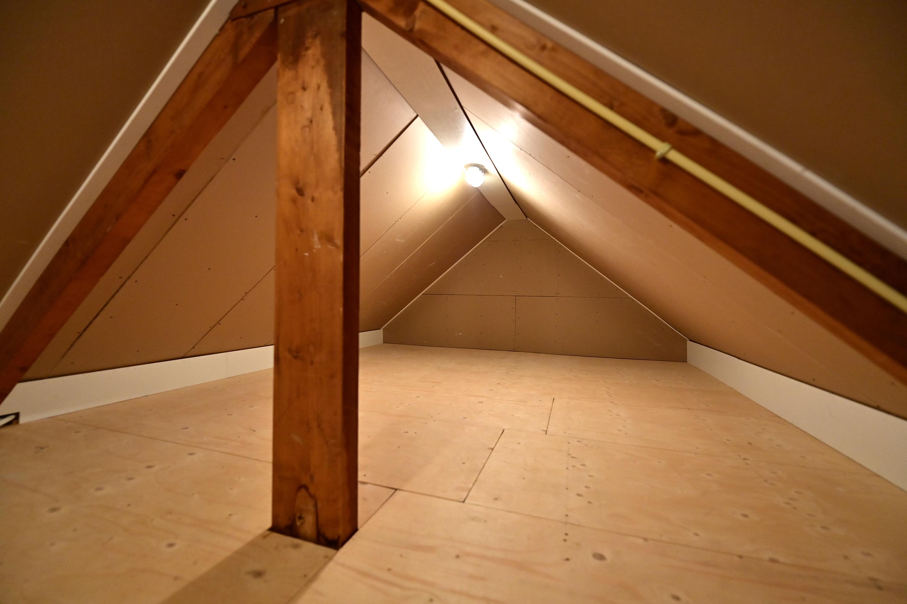 Vaste trap naar geïsoleerde zolderverdieping. Deze zeer ruime en lichte verdieping heeft twee dakkapellen en drie kantelramen.