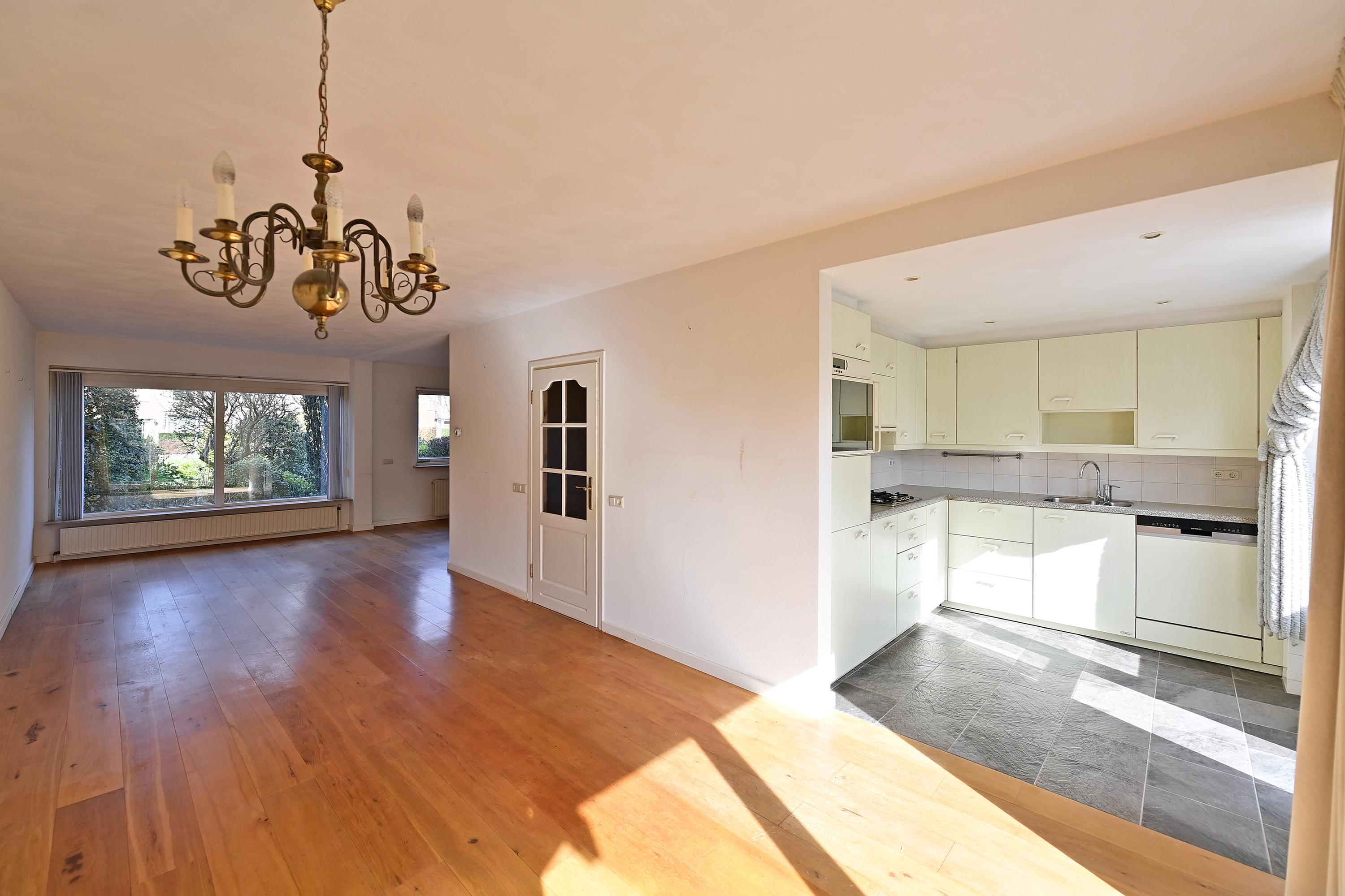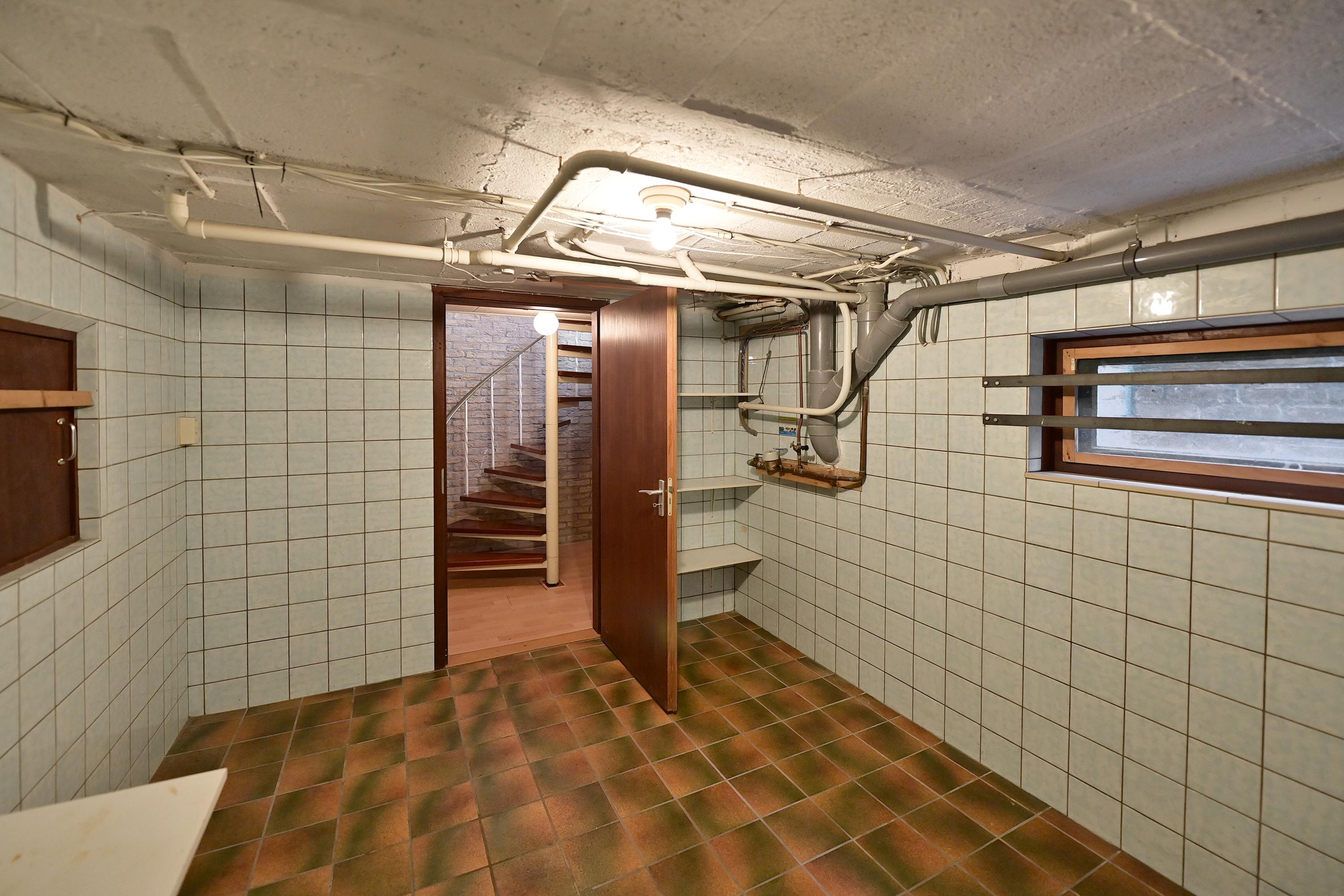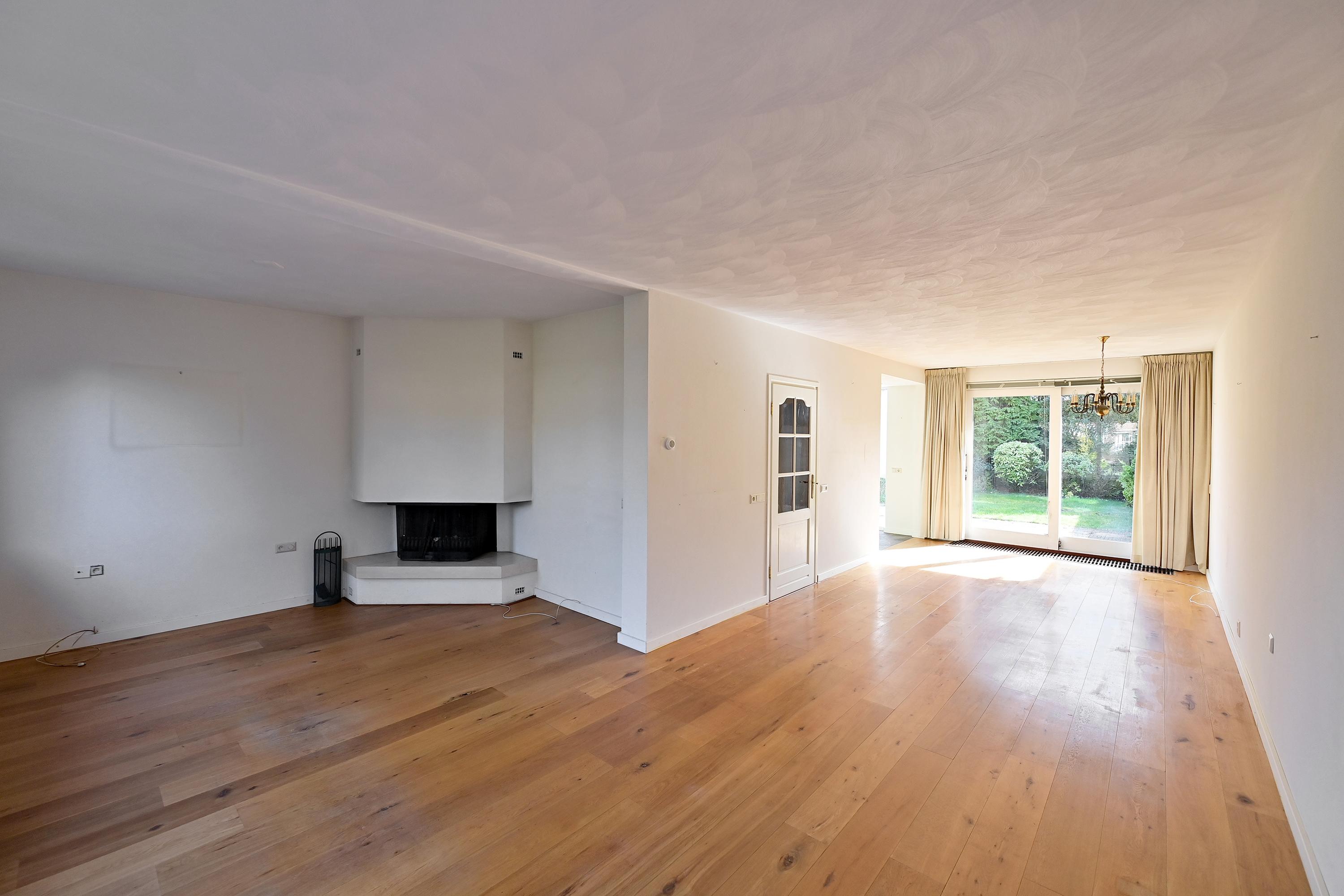 Entrance, hall, toilet with washbasin; stairs from the hall to a full-height basement divided into 2 rooms, totaling 16 m²; spacious L-shaped living room (approx. 40 m²) with fireplace and sliding doors to the south-facing garden. Open kitchen with various built-in appliances.