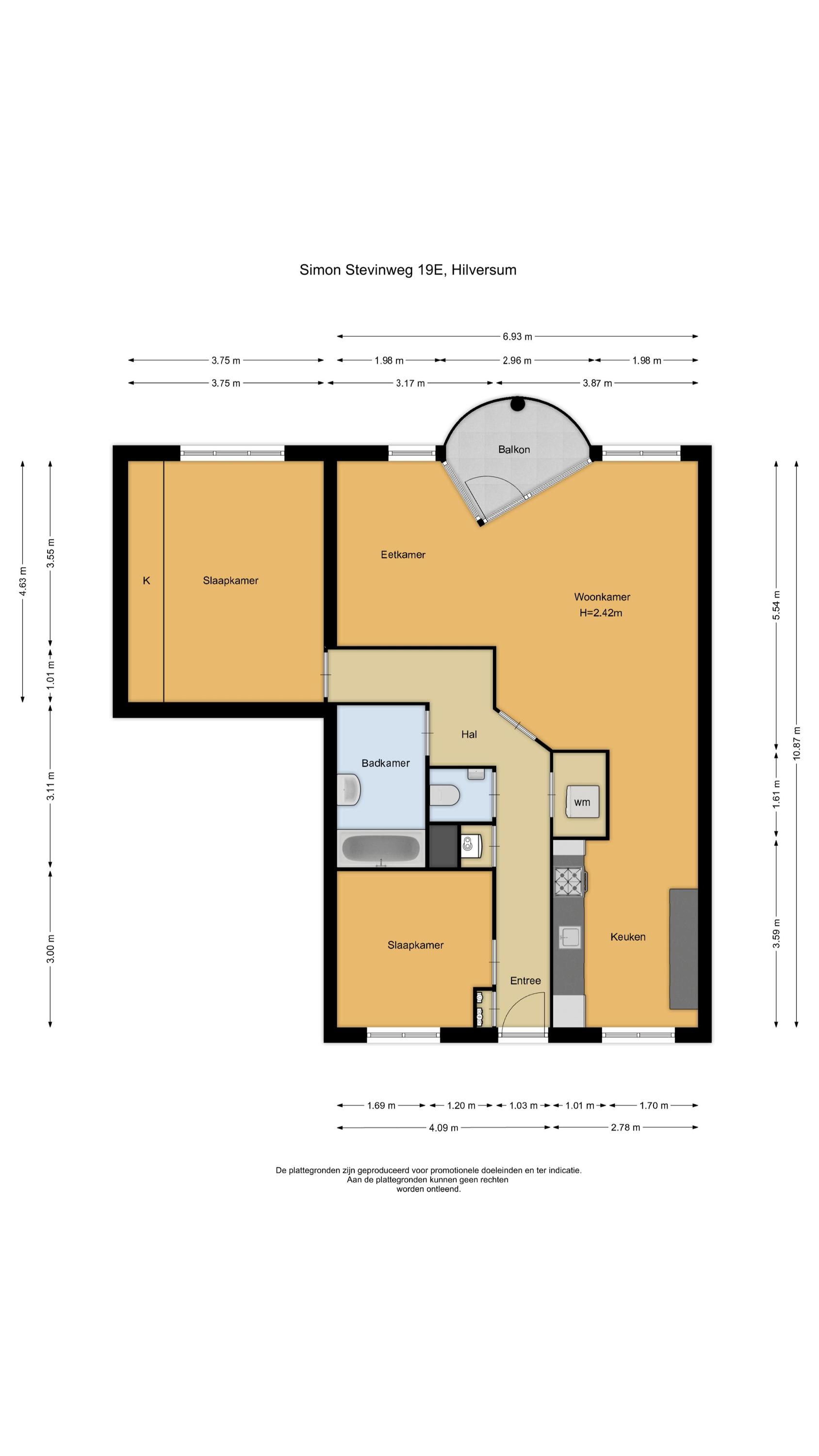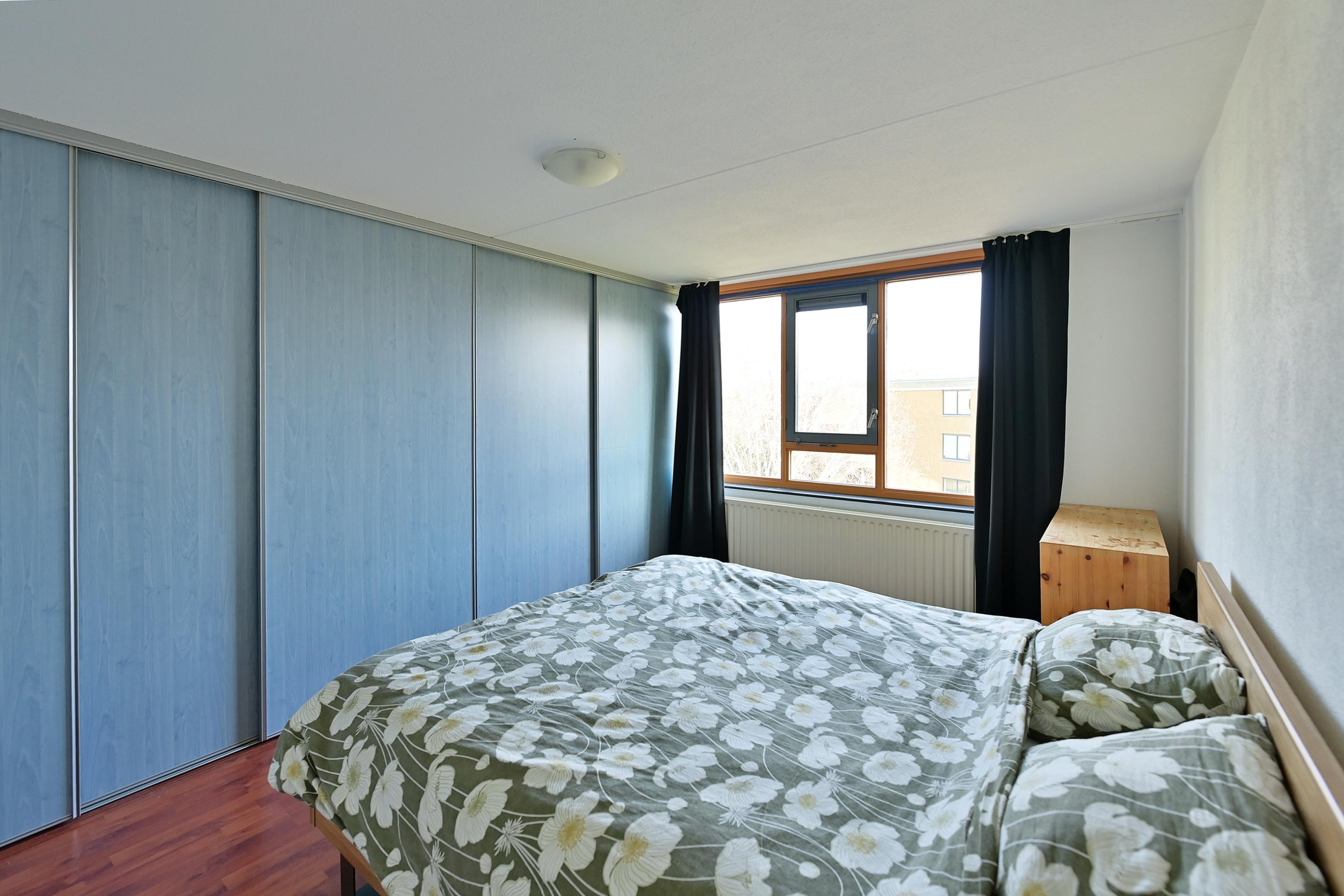 Ruime L-vormige woon-/eetkamer met deur naar het balkon, open keuken aan de galerijzijde met twee werkbladen, diverse inbouwapparatuur o.a. vaatwasmachine. Grote slaapkamer aan de voorzijde met schuifkastenwand.