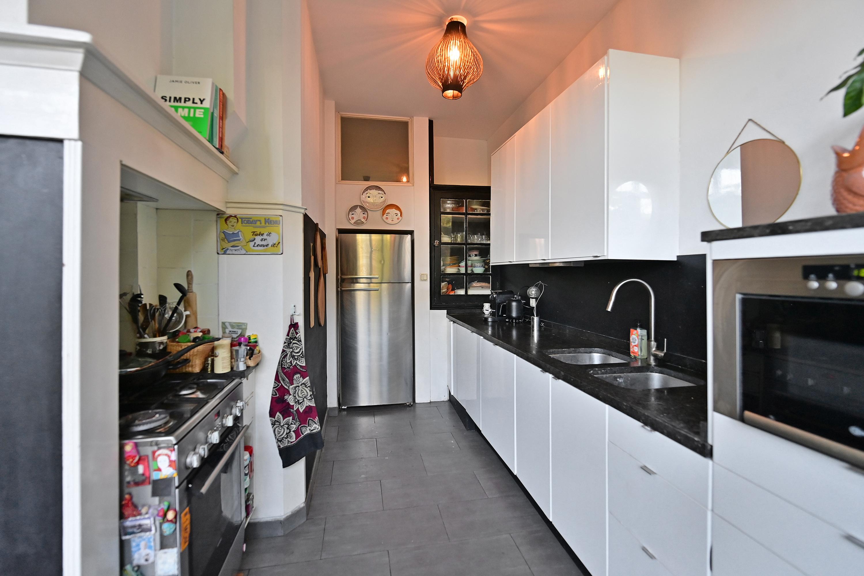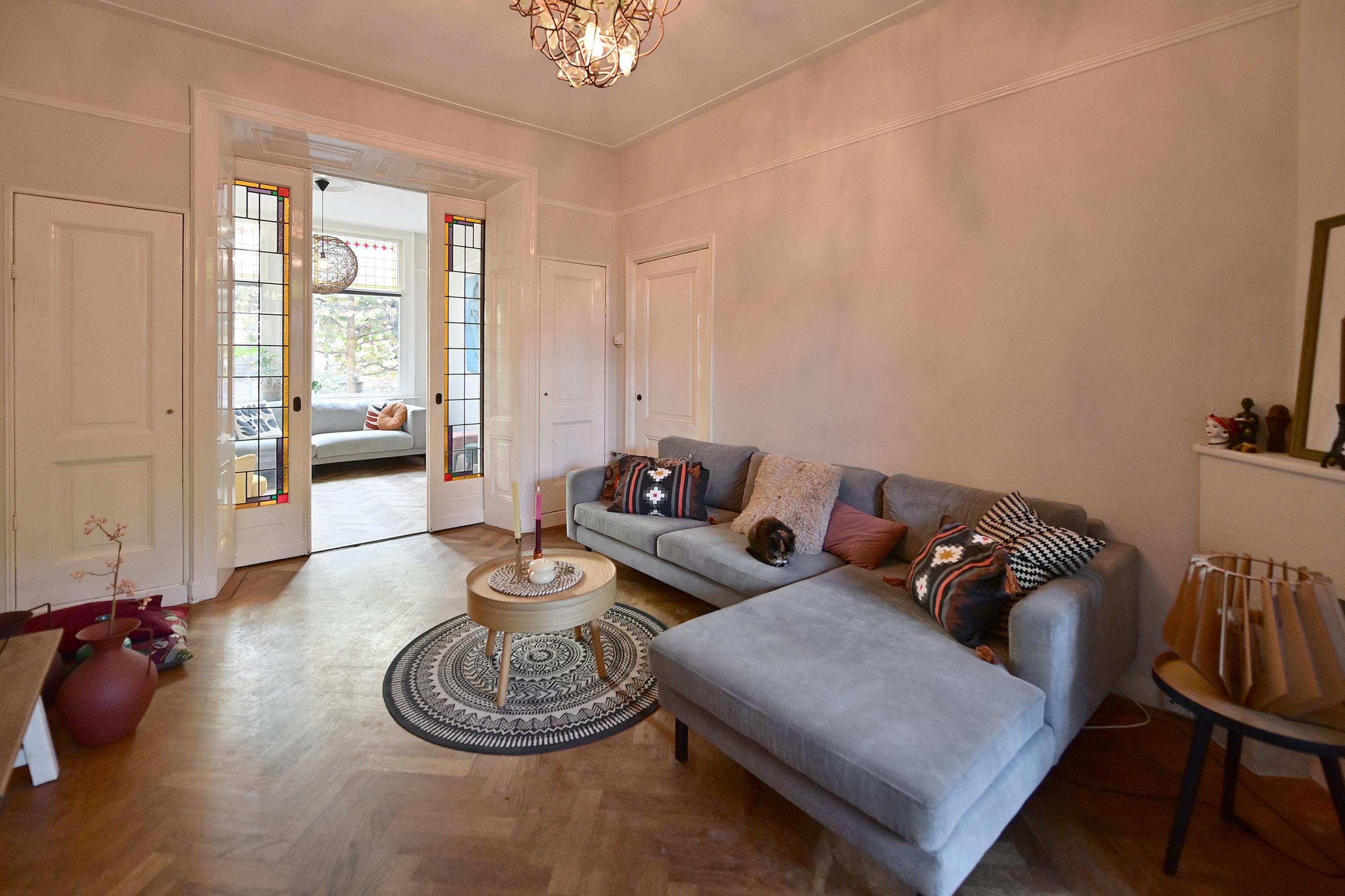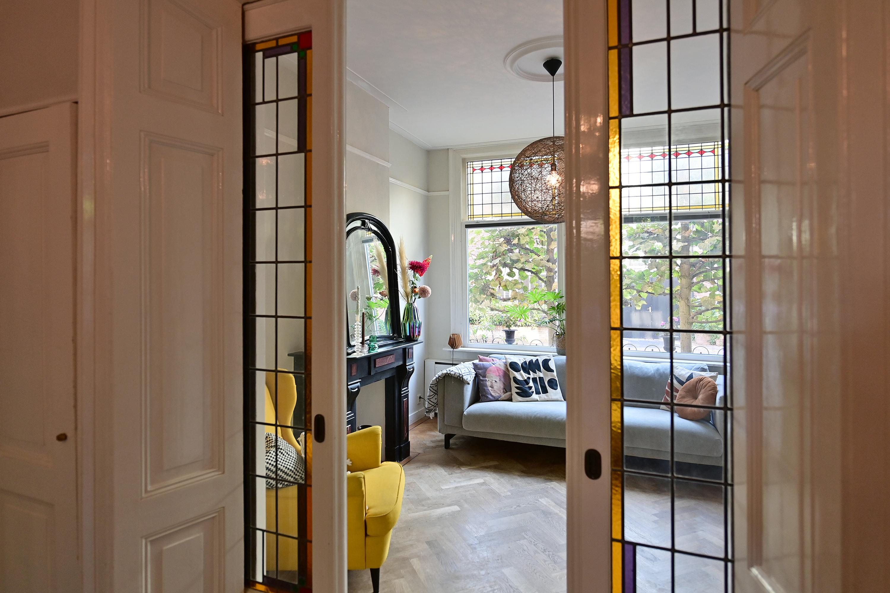 Vanuit de hal loopt u door naar de heerlijke woonkamer en suite met parketvloer, originele stijlkenmerken zoals marmeren schouw, glas in lood en meer dan drie meter hoge plafonds. De moderne eetkamer en keuken zijn ruim want de woning is hier 3,5 meter uitgebouwd.