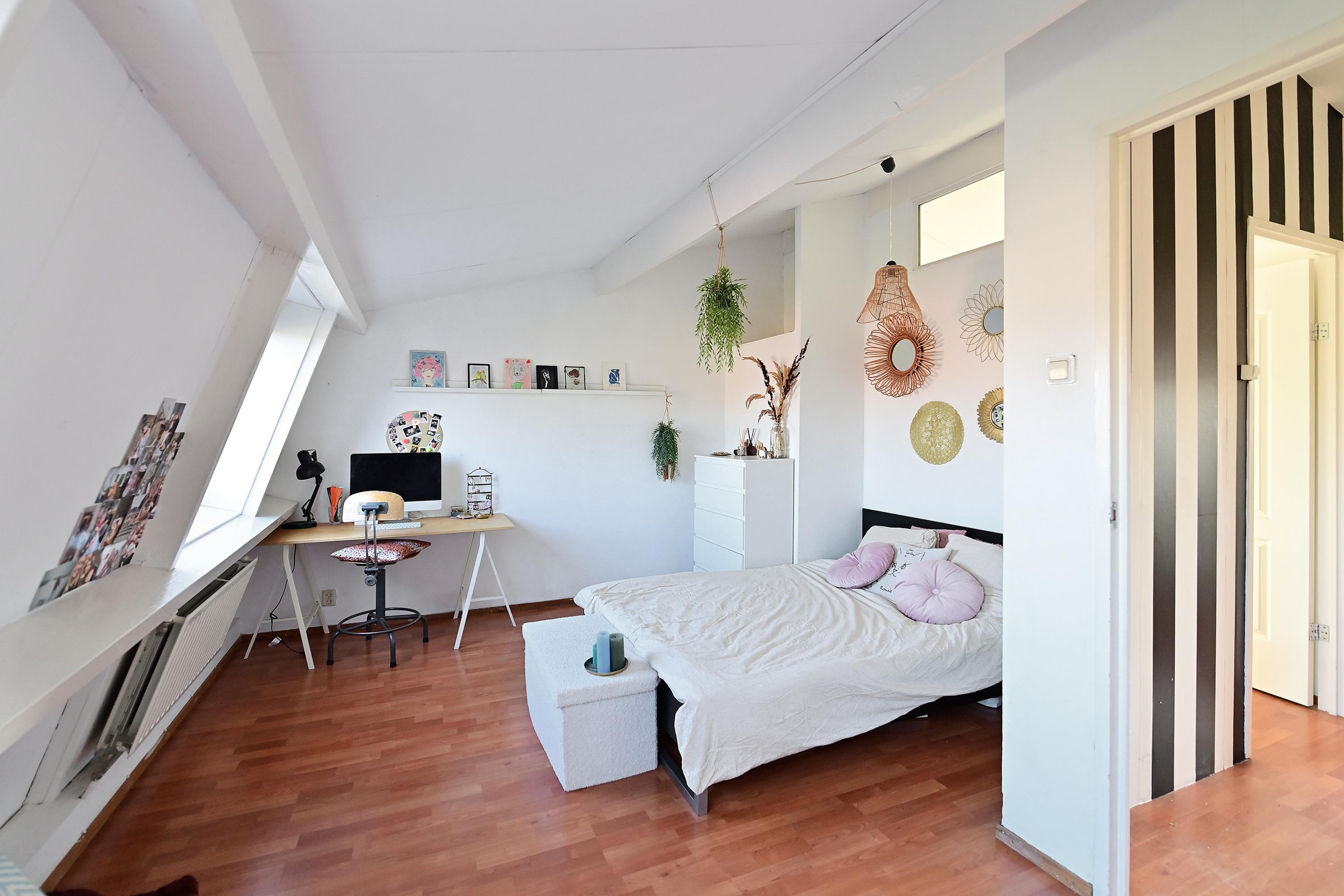 Op deze verdieping is direct bovenaan de trap de badkamer met inloopdouche, dubbele wastafel, ligbad en vloerverwarming. Daarnaast ligt een mooie slaapkamer met openslaande deuren naar het dakterras van 21 m². Aan de voorzijde van de woning bevindt zich de tweede, ruime, slaapkamer en de derde, kleinere slaapkamer.