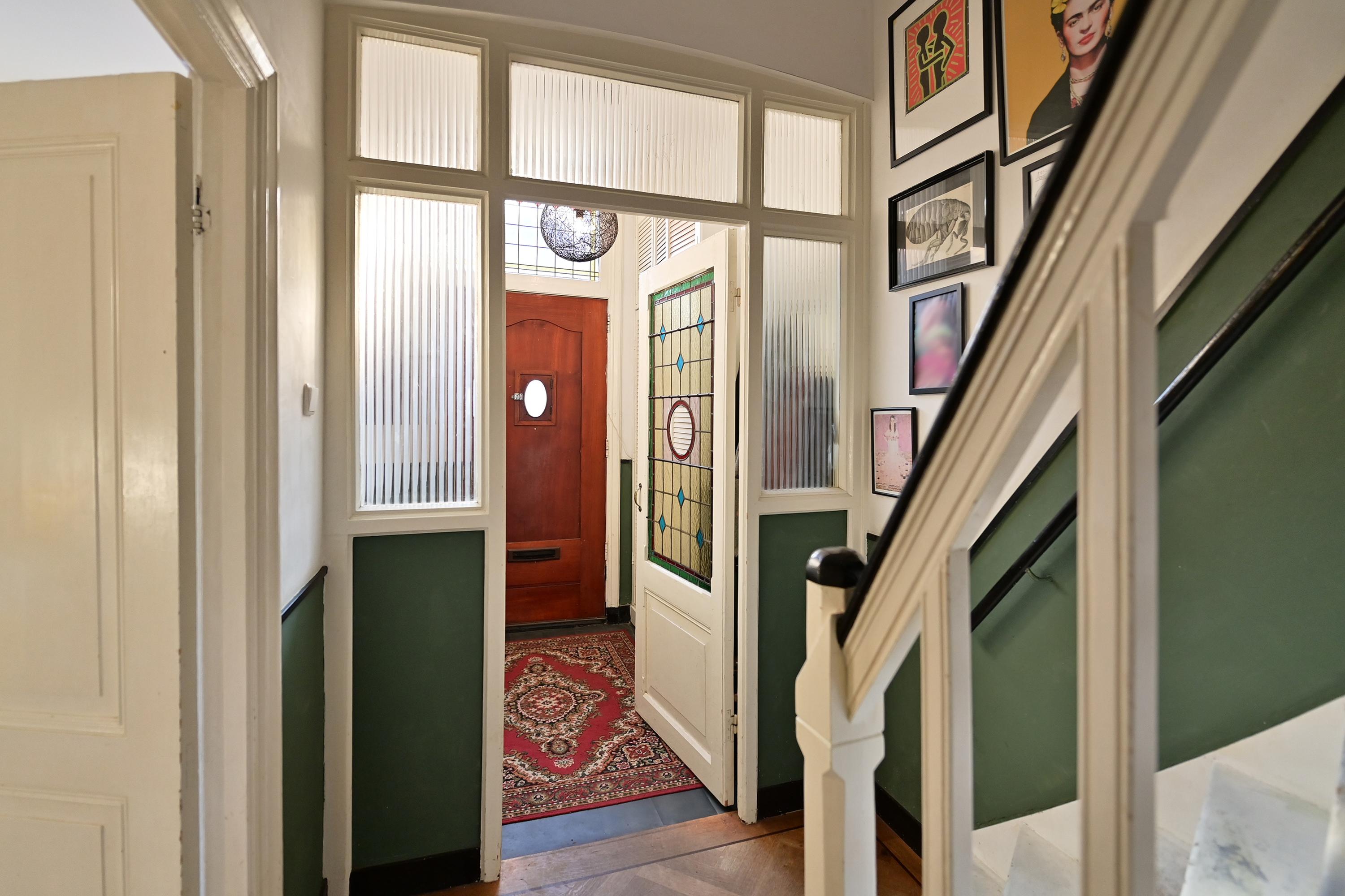 Via de voordeur komt u in de vestibule met prachtig glas-in-lood. Daarna komt u in de hal met de klassieke trapopgang en originele lambrisering, het toilet met fonteintje en toegang tot de sta hoogte provisiekelder.