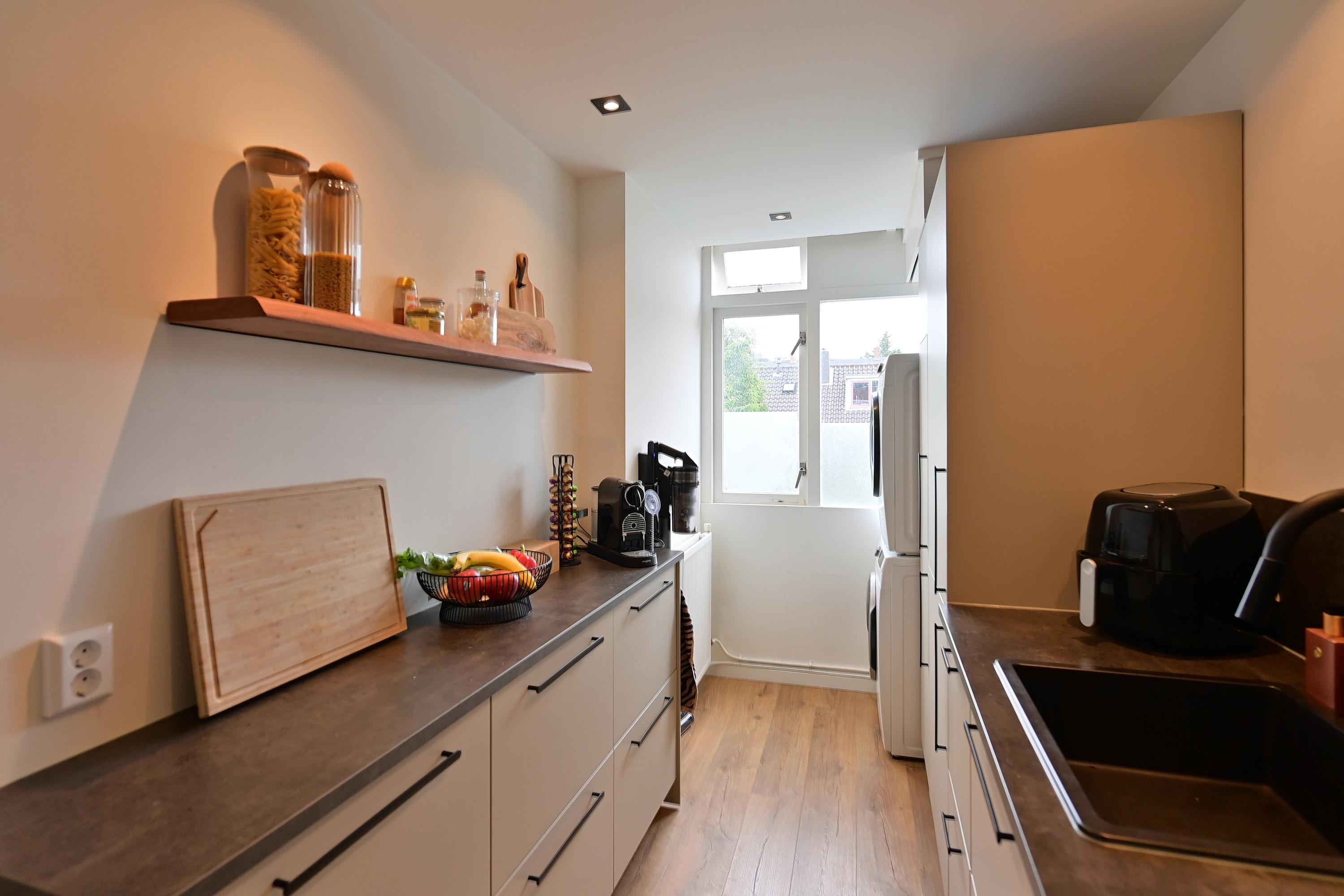 Slim ingerichte, strakke keuken met inductiekookplaat, afzuigkap, oven, vaatwasser en ingebouwde koelkast en vriezer.
