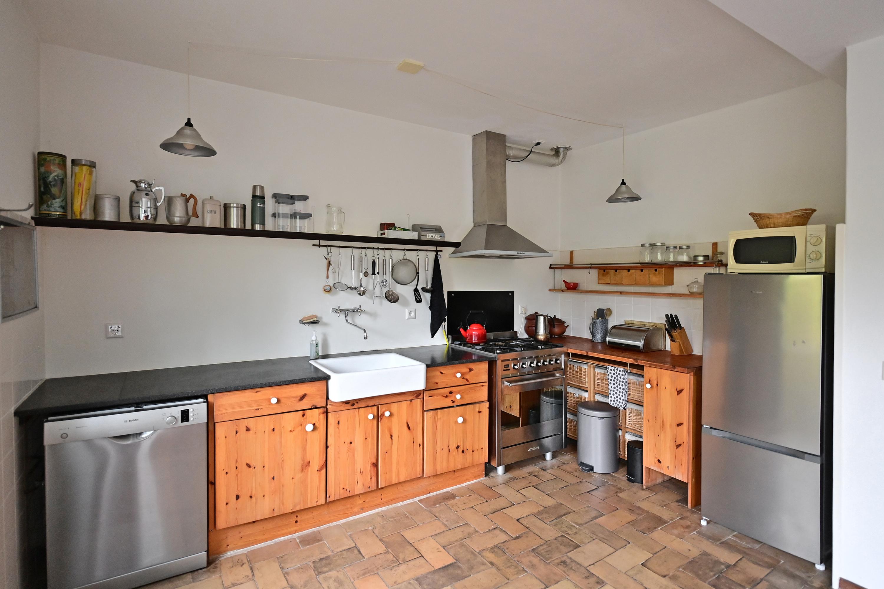 Entree, hal met meterkast en toilet. Ruime, lichte woonkamer met fraaie houten vloer, stalen houtkachel en L-vormige keuken. Deur naar de achtertuin.