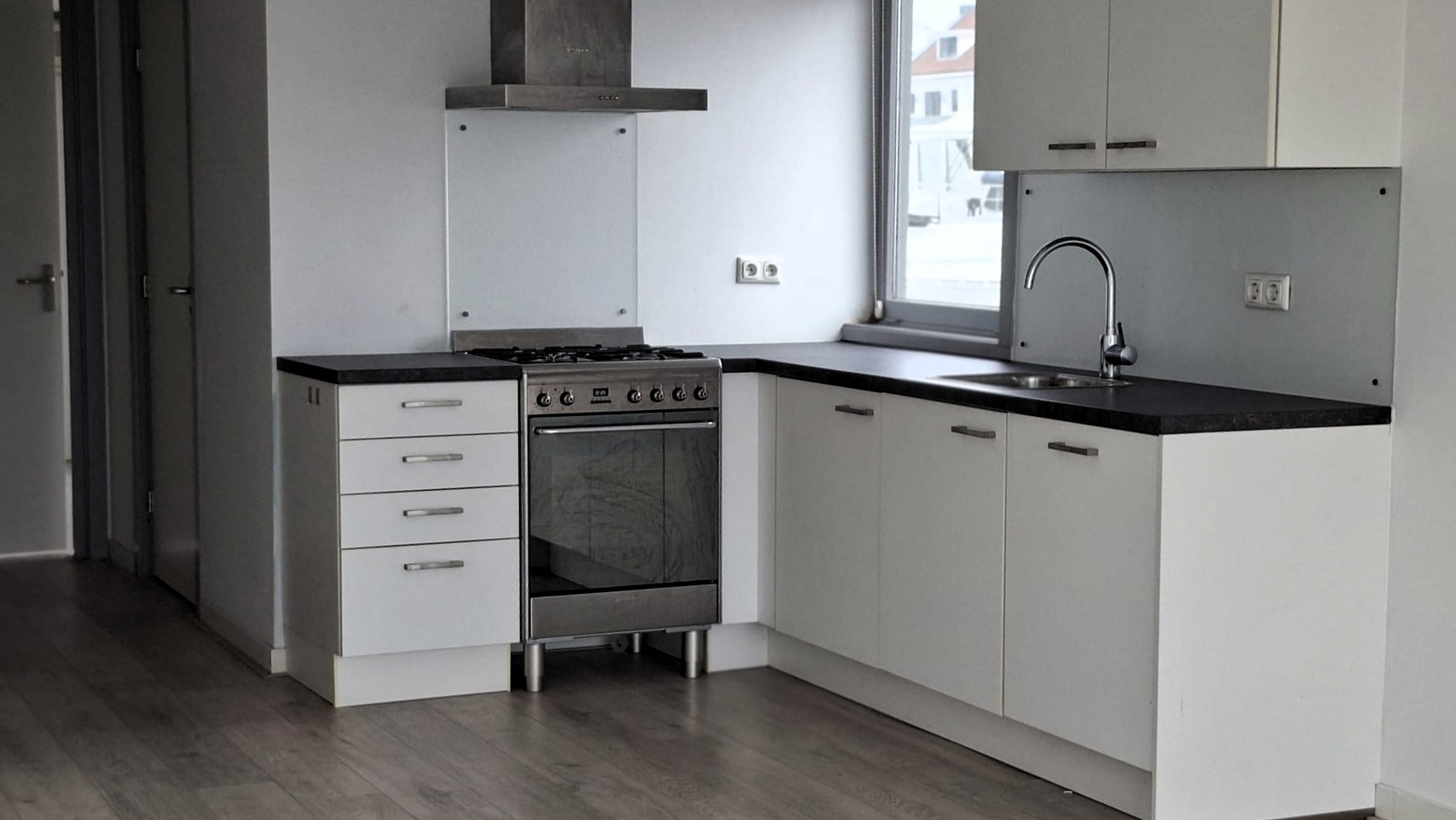 Indeling: woonkamer met moderne open keuken met div apparatuur, kastruimte.