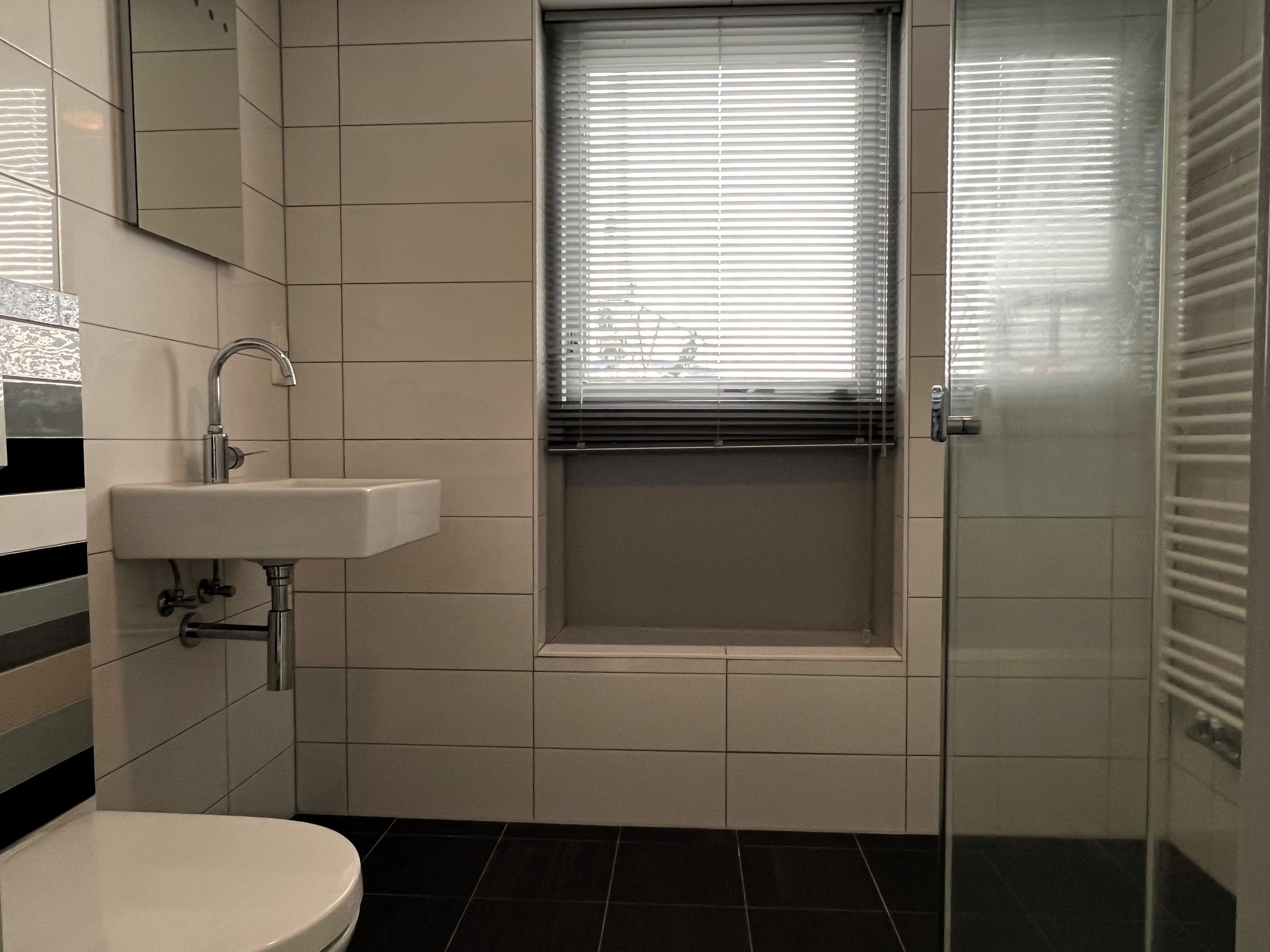 Slaapkamer, badkamer met modern toilet, wastafel en douche.